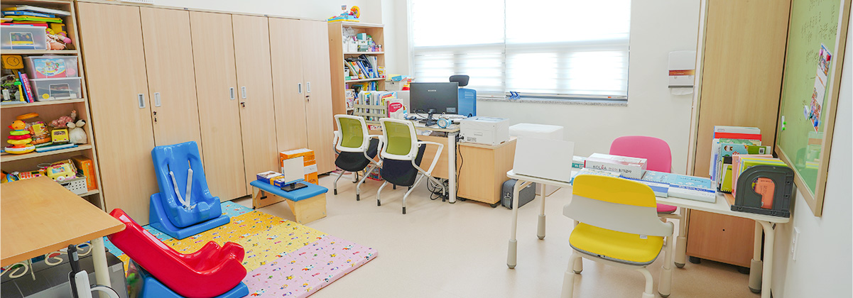 언어치료실에서는 정확한 언어진단을 통해 이에 맞는 수용, 표현 언어 증진, 호흡-발성 치료, 조음 치료, 유창성 치료 등을 제공하여 말-언어 발달을 유도하며 원활하게 의사소통이 이루어지도록 하고 있습니다.