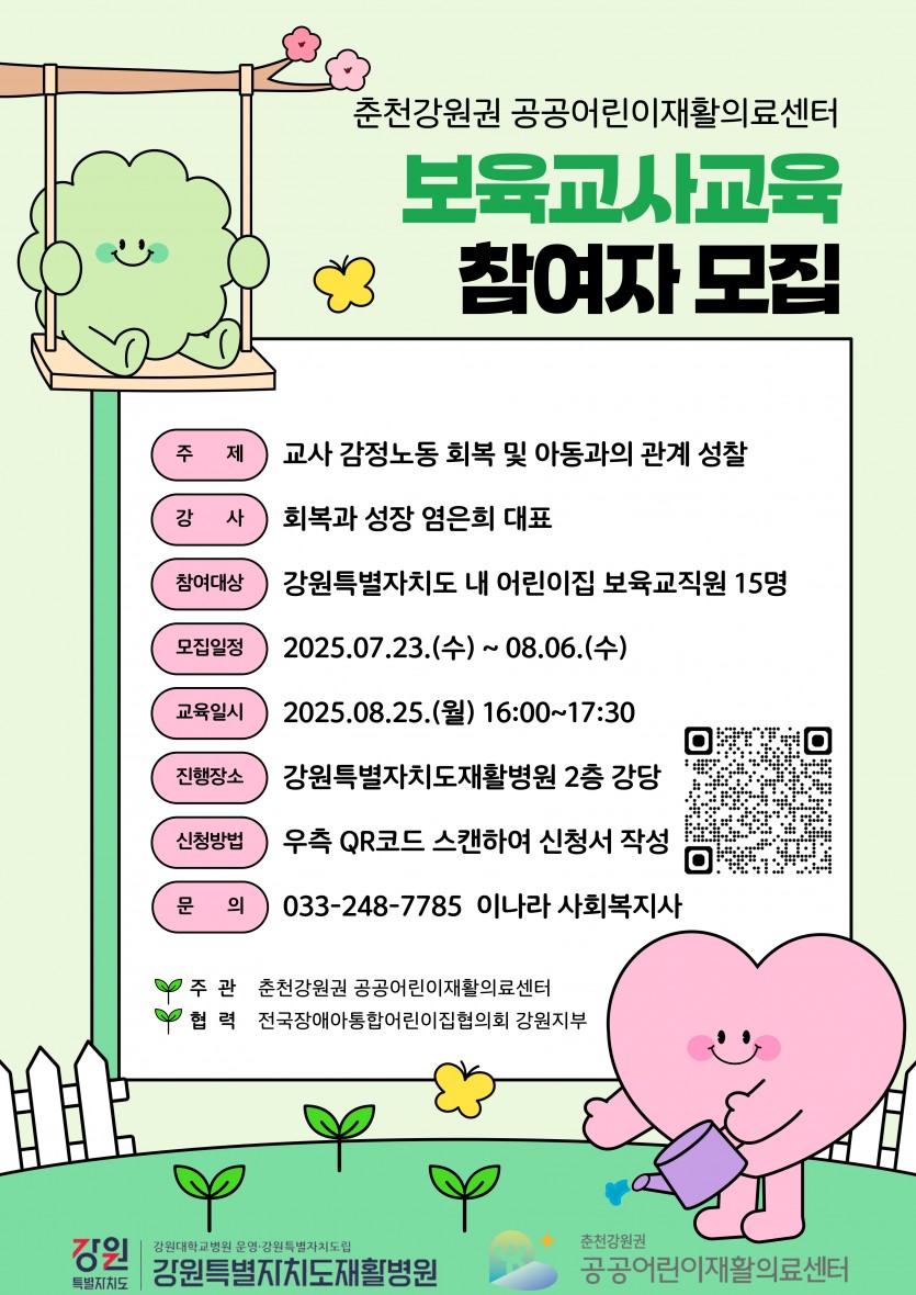 페이지 정보 작성자 최고관리자 작성일2025-07-24 09:13 목록 2025-2차 보육교사교육 참여자 모집 본문 [이 게시물은 최고관리자님에 의해 2025-07-24 09:16:47 공공재활 공지에서 복사 됨] Prev2025 하반기 공공어린이재활프로그램 안내 2025.07.24 Next2025 발달장애인가족지원 캠프(SST-강원) 참여 가족 모집 2025.06.24