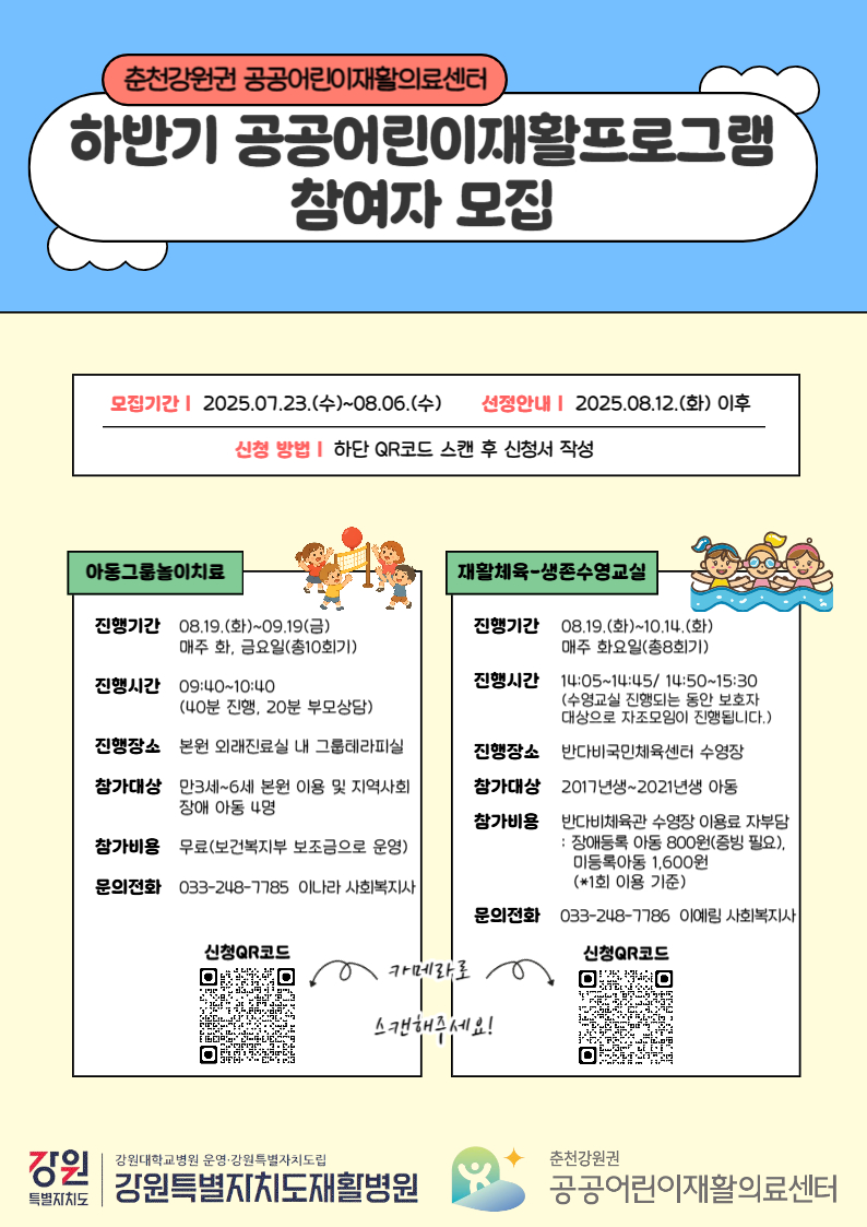 페이지 정보 작성자 최고관리자 작성일2025-07-24 09:15 목록 2025 하반기 공공어린이재활프로그램 안내 본문 Prev부모교육 '회복의 쉼표, 부모 스트레스 관리' 참여 신청 안내 2025.09.18 Next2025-2차 보육교사교육 참여자 모집 2025.07.24