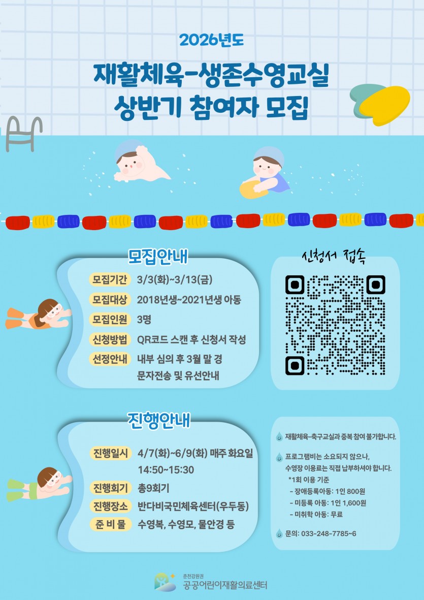 페이지 정보 작성자 최고관리자 작성일2026-03-03 15:30 목록 2026 재활체육-생존수영교실 상반기 참여자 모집 본문 . Next재활체육-축구교실 참여자모집 안내 2026.02.06